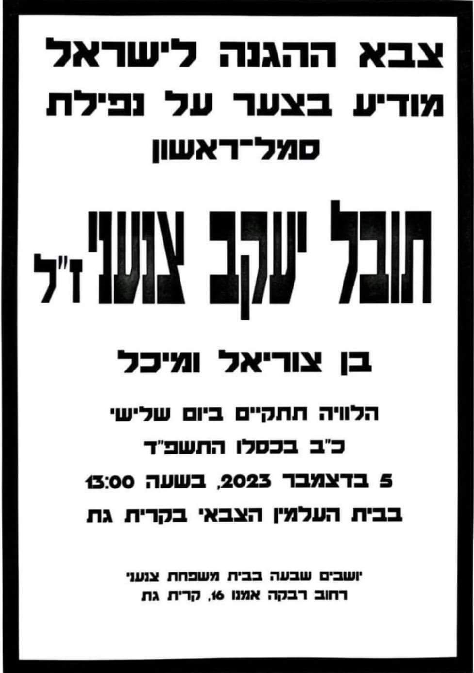 אבל כבד נפל על העיר קרית גת עם היוודע דבר נפילתו של סמ"ר תובל יעקב צנעני ז"ל.