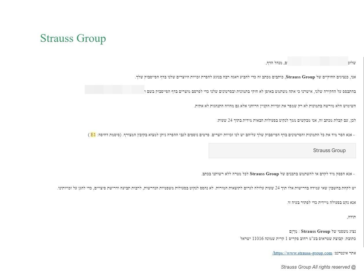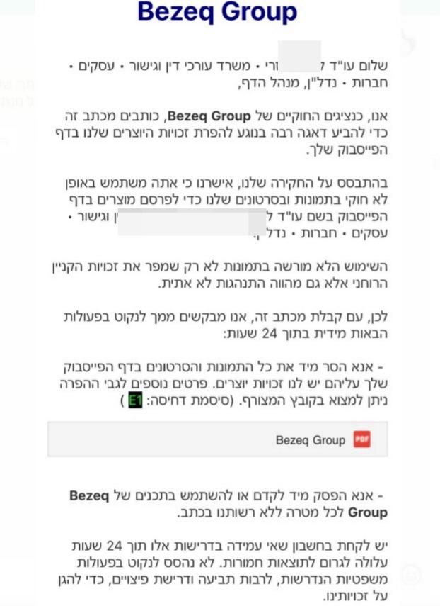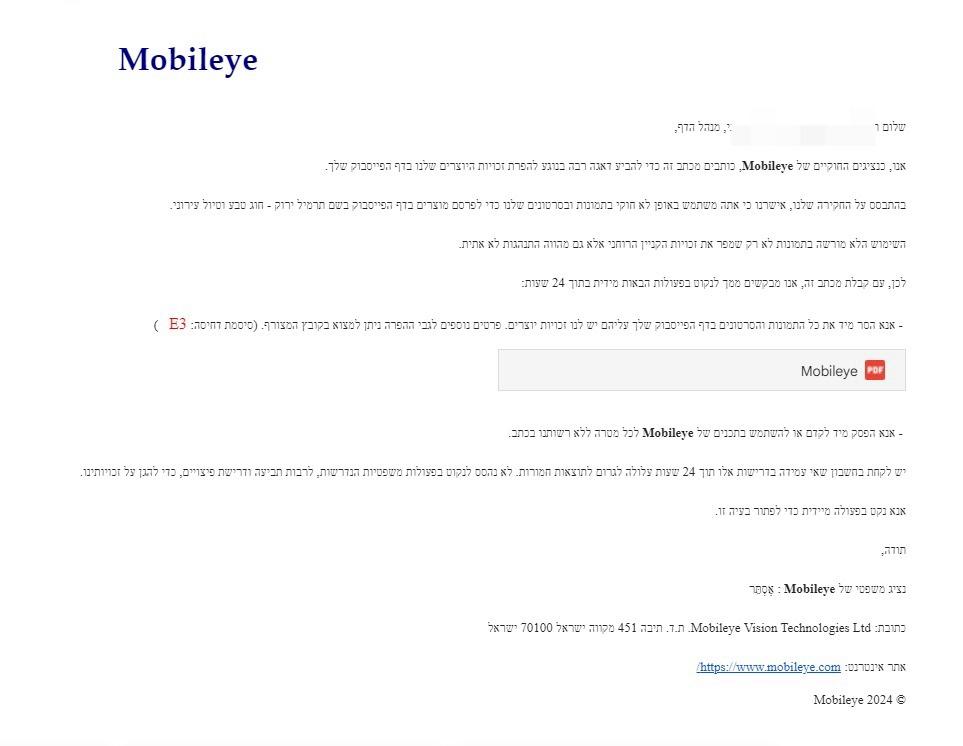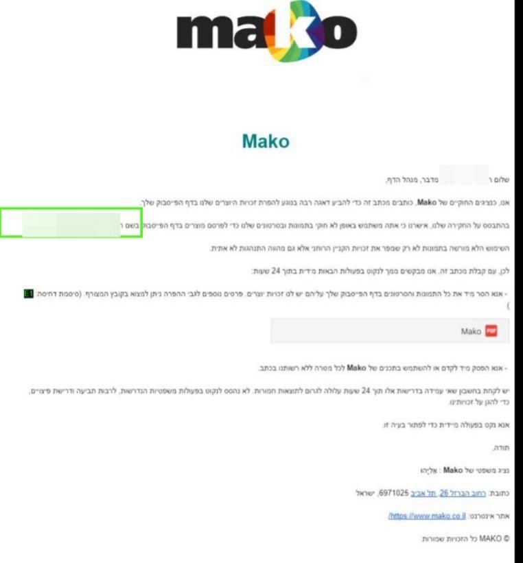 כפי שניתן לראות בדוגמאות המצורפות, האימייל מנוסח בעברית עם לוגו בולט של החברה השולחת (כל פעם חברה אחרת) ועם איום שטוען שהנמען השתמש ללא רשות בתמונות או קבצים בבעלות החברה השולחת. כדי לראות את אותן תמונות "הנעקץ" מתבקש לפתוח קובץ PDF המצורף באמצעות לינק לאתר דרופבוקס – כדי לעורר את סקרנותו ולהלחיץ אותו לפתוח את הקובץ. האינסטינקט הראשוני של מנהל עמוד פייסבוק שמקבל הודעה כזאת היא לבדוק באיזה תמונות מדובר ולכן מפנים אותו ישר לקובץ שכביכול מכיל את פרטי ההפרה מתוך מחשבה שהקורבן ימהר לבדוק אותם. חשוב לציין שבראש הפנייה במייל מציינים גם את שם עמוד הפייסבוק שאותו הנעקץ הפוטנציאלי מנהל כך שנוצרת תחושה שמדובר בפנייה אישית ממוקדת אליו.