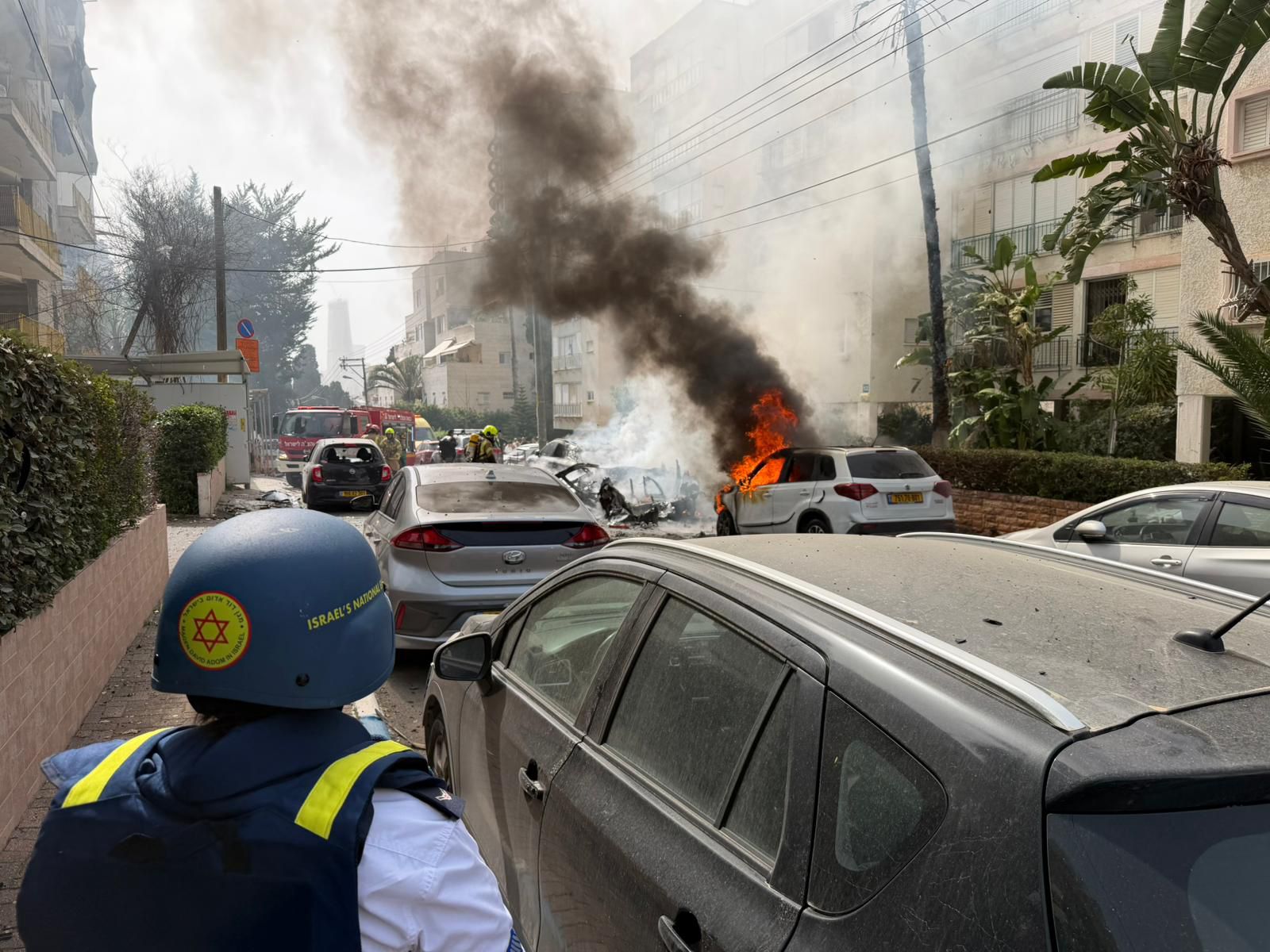 חובש בכיר במד״א ליאור פז סיפר: ״קיבלנו דיווחים על מספר זירות נפילה ויצאנו באמבולנסים, ניידות טיפול נמרץ ואופנועי מד״א למקום, הגענו לזירה תוך דקות בודדות וראינו הרס, אש, זכוכיות מנופצות על הרצפה ועשן רב. החלנו בסריקות נרחבות במקום, ולמזלנו לא אותרו נפגעים בגוף. אנחנו ממשיכים לסרוק את הזירות ונשאר כאן ככל שיידרש, יש להישמע להנחיות פיקוד העורף ובזמן אזעקה להיכנס למרחב מוגן״.