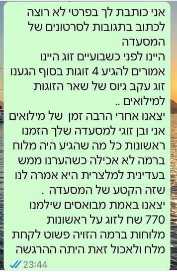 "זאת חלק מהמציאות שלנו. וחשוב לי להציג גם אותה לפעמים. יש מלא פרגון ומלא מחמאות. אבל יש גם לא מעט נפילות ולא מעט אכזבות של לקוחות. אנחנו עושים הכל כדי שיהיו כמה שפחות כי לשם כך מסעדות נפתחות. אני לא מכיר מסעדן שפותח מסעדה כדי לאכזב אנשים. עושים הכל כדי לגרום לאנשים לחייך ולמצוא אי של שקט בחיים מידי פעם.אבל זאת המציאות. על בסיס יום יומי. חשוב לי שתדעו שכל צוות המסעדה מסור במאה אחוז למטרה הזו ועושה הכל כדי שהמקרים האלו לא יחזרו על עצמם. סליחה ממי שאכזבנו. תגידו לנו.זה בונה אותנו. תודה/
