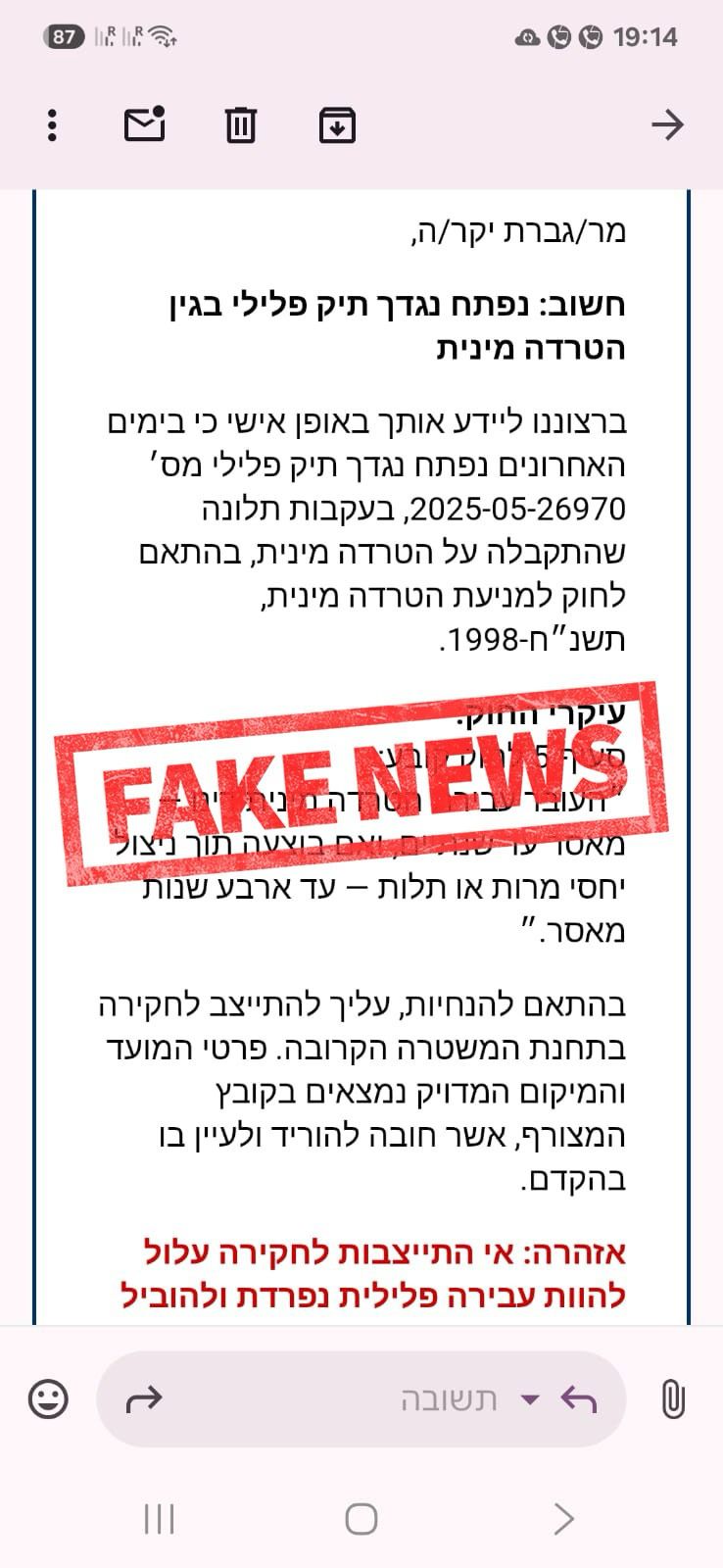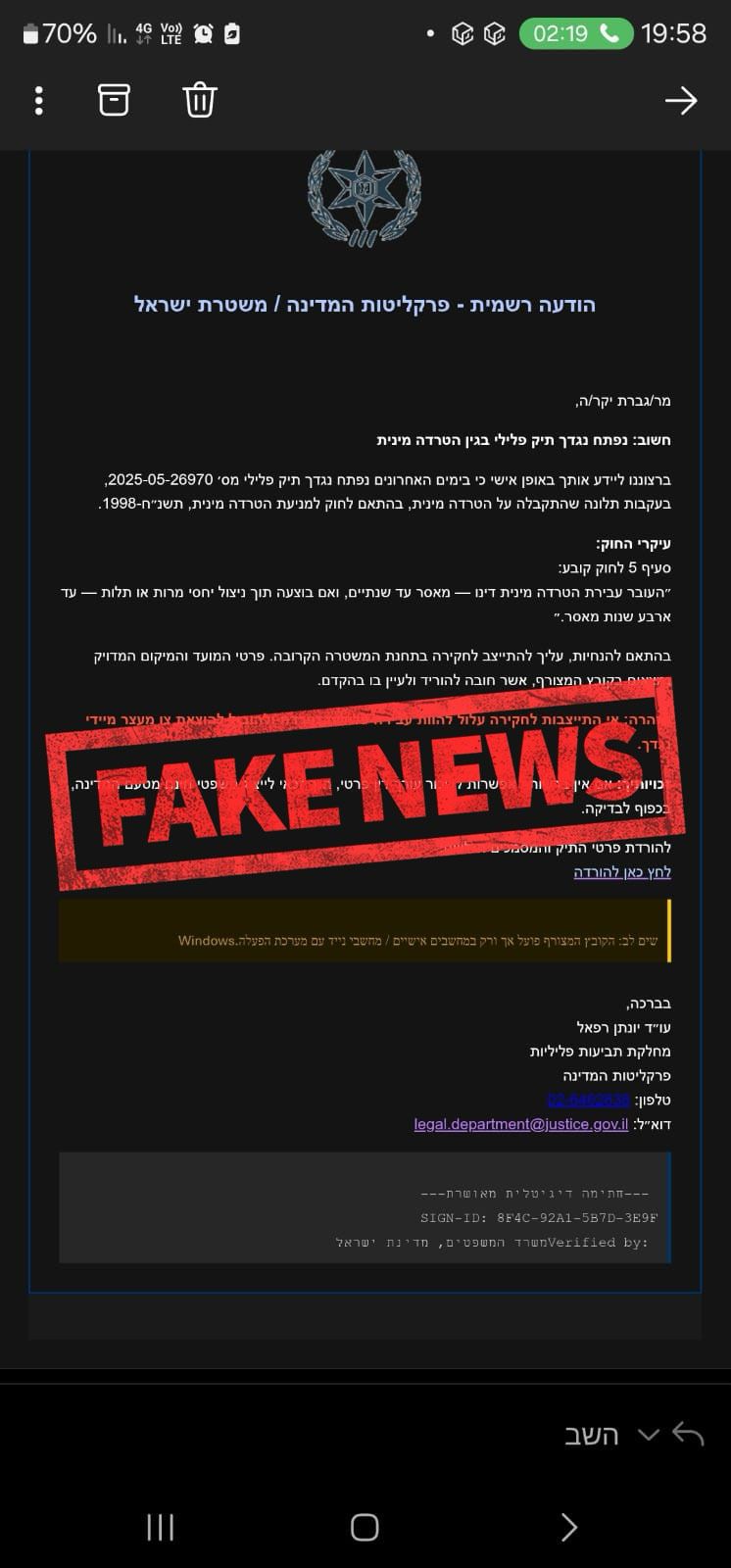 בימים האחרונים מופצות הודעות באופן אקראי לדואר האלקטרוני ובהודעות SMS של אזרחים תחת הכיתוב- ״נפתח נגדך תיק פלילי בגין הטרדה מינית״. בנוסף, לתוכן ההודעה מצורף קישור להורדת פרטי התיק והמסמכים הנלווים לכאורה.