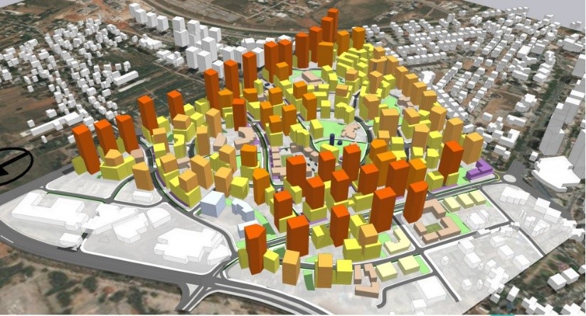 במסגרת התוכנית יפונו מהמתחם כ-769 יח"ד קיימות (כ-189 יח"ד בשיכונים בני 3-4 קומות, כ-96 יח"ד במבני מגורים גן-גג (2 קומות) וכ-585 יח"ד צמודי קרקע). הבינוי החדש מאופיין בבנייה מרקמית ומגדלית של עד 30 קומות. לצד המגורים, מתוכננת מערכת תנועה המבוססת על השלד הקיים, הירארכיה ודגש על תנועת הולכי רגל. התכנון כולל שילוב בנייה מרקמית וגבוהה תוך הדגשת צירים, לב ציבורי של פארקים ומוסדות וחלוקה למתחמים ומנגנוני מימוש.