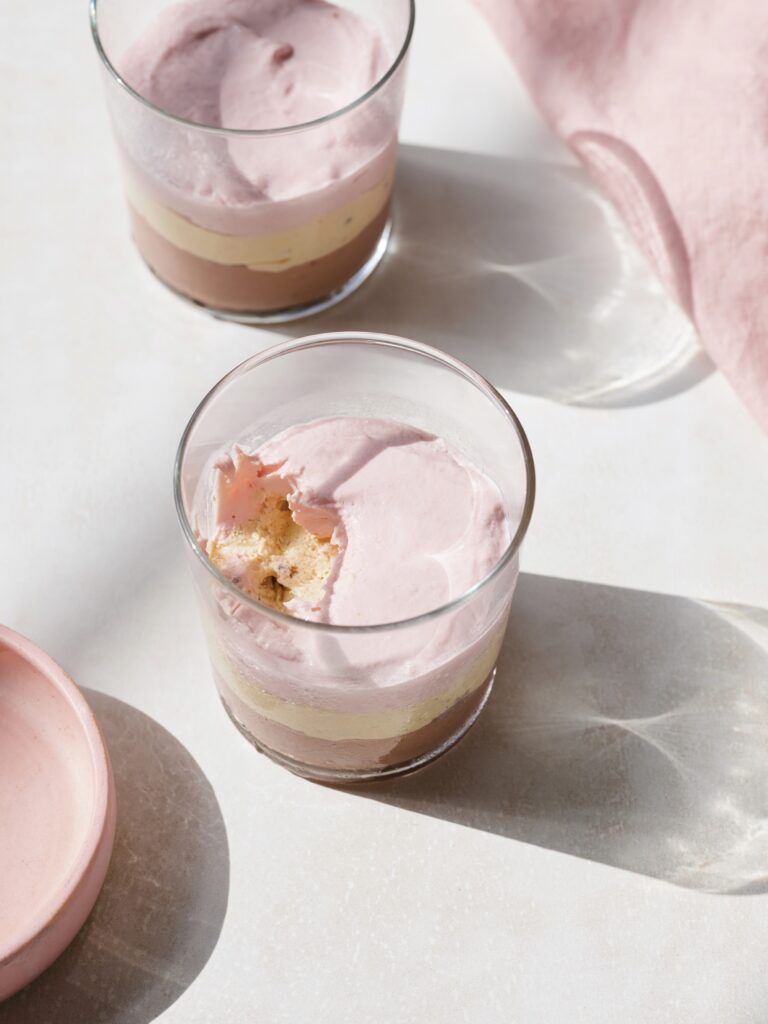 - מוסיפים לקערה השלישית את אבקת הפורמולה 1 בטעם תות, מערבבים היטב ויוצקים לכוסות. משטחים לשכבה אחידה, מכסים בניילון נצמד ומצננים במקרר שעה.