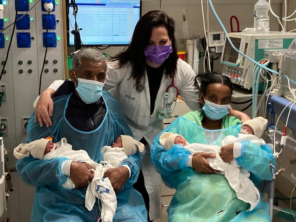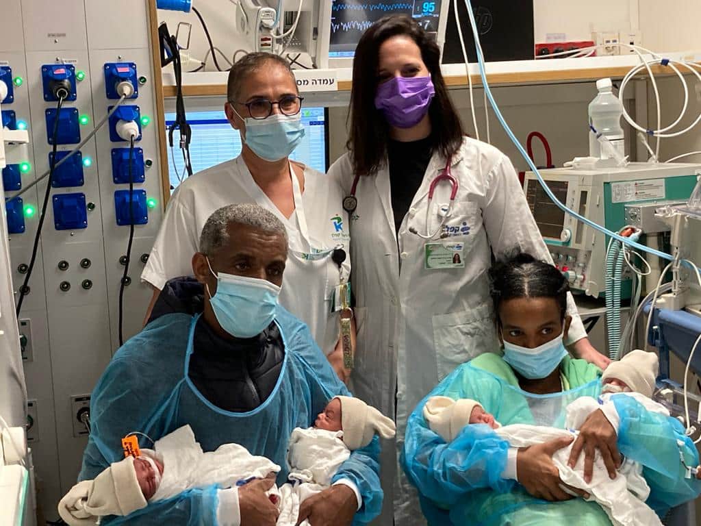 ד"ר כלנית שפורן סגנית מנהלת פגיה ומחלקת ילודים את התינוקות מספרת "את התינוקות קיבלו ארבעה צוותים רפואיים שכללו רופאי ואחיות פגיה ומיילדות. במהלך הלידה היה שיתוף פעולה מלא בין הצוותים על מנת לסייע לאם ולילודים לעבור את הלידה בשלום. הפגים נזקקו לתמיכה במצבם הנשימתי והועברו לפגייה להמשך טיפול וכעת מצבם יציב, הם חשים בטוב ועתידים להשתחרר בקרוב".
