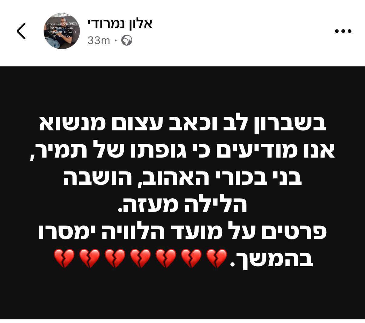 ״אחרי שנתיים של חוסר וודאות מייסר, מלא בתקווה ורצון לסיום אחר, קיבלנו את ההודעה הקשה על זיהויו של תמיר האהוב שלנו. תמיר נחטף באכזריות מבסיסו ונרצח בשבי חמאס. תמיר הושב אתמול לישראל למנוחת עולמים. אנחנו ברגעי כאב והתכנסות, אבל אנחנו לא נעזוב את משפחות החטופים והחטופה עד השבת החטוף האחרון״.