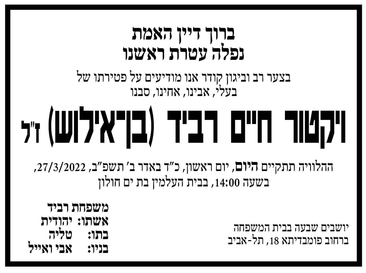 עצוב מאוד: חיים (ויקטור) רביד, מייסד רשת הקמעונאות 'ויקטורי' הלך לעולמו. הלוייתו תיערך היום בשעה 14:00 בבית העלמין חולון. מחווה מיוחדת לאבי ויקטורי: הרשת תסגור את סניפיה בזמן הלוויה, בין השעות 14:00-15:30. המשפחה תשב שבעה ברחוב פומבדיתא 18 בתל אביב. בנו אייל רביד כתב בפייסבוק: "נפלה עטרת ראשנו, אבא שלי הגיבור, האחד והיחיד". אחיו אייל העלה פוסט על סגירת חנויות הרשת בזמן הלוויה וציין: "אבא שלי לכבודך, מייסד ויקטורי, ויקטורי על שמך, תרכין היום ראש לזכרך"
