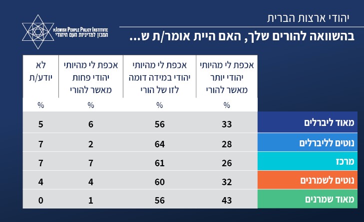 בקרב השמרנים 99% הסכימו לקביעה זו, בעוד שבקרב היהודים שהם "מאד ליברלים" מדובר ברוב קטן בהרבה (52%).