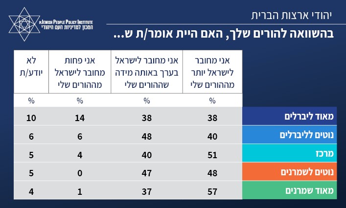 אצל היהודים המזדהים כשמרנים, יש רוב מוחלט (57%) שהצהירו כי הם מחוברים לישראל אף יותר מהוריהם. מרבית המשיבים, בכל הקבוצות האידיאולוגיות, השיבו שאכפת להם מהיותם יהודים במידה דומה לזו של הוריהם.