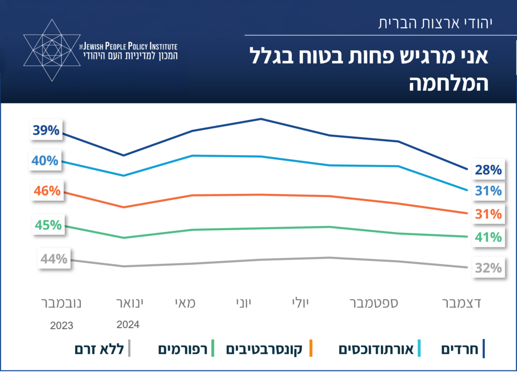 אמנם קצת מעל שליש מהמשיבים במחקר (36%) מעידים שהמלחמה בישראל גורמת להם להרגיש פחות בטוחים, ו-46% נוספים מעידים שהמלחמה משפיעה "קצת" על דאגותיהם לביטחונם, אולם בהשוואה לחודשים קודמים, נתונים אלה מהווים שיפור מסויים מבחינת תחושת הביטחון של המשיבים.