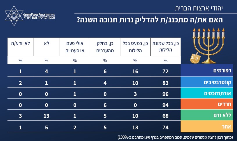 סקר JPPI"קול העם היהודי" דצמבר 2024: עד כמה מחוברים יהודי ארה"ב לישראל וליהדות? רוב מוחלט של יהודי ארה"ב, מכל הזרמים, מדליקים נרות חנוכה בביתם; 90% מהיהודים נמנעים מהצבת עץ אשוח בביתם