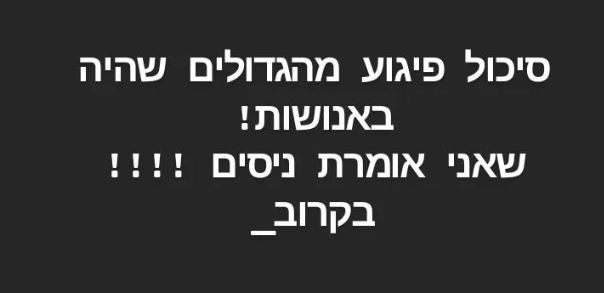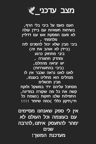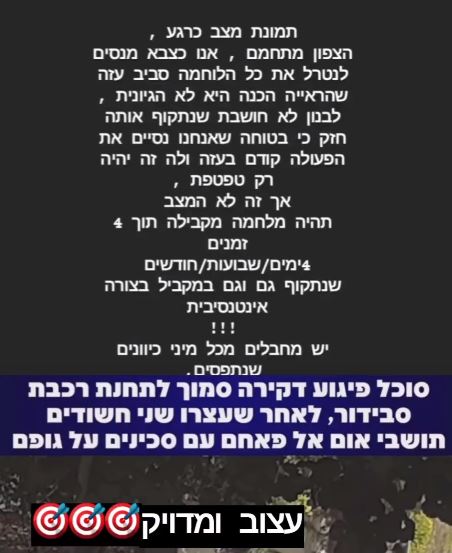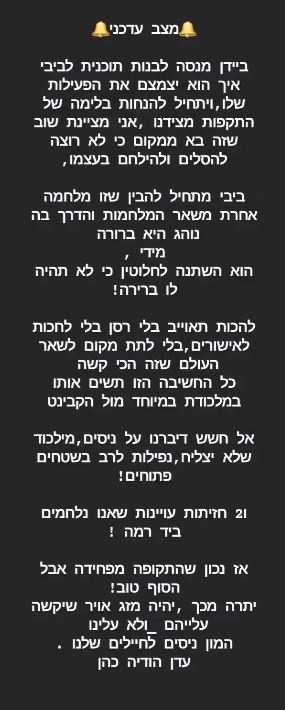 עוד אמרה: בתוך 4 זמנים שהם 4 ימים / 4 שבועות / 4 חודשים תיעשה היסטוריה – שתגרום להסלמה עולמית, סכסוך בין מדינות. יפתיעו את אמריקה כי היא נמצאת לצידנו – והיא גם תצטרך להילחם. מה שביידן חשב הוא שיסגור את המלחמה עם משא ומתן – אבל הוא יבין שאין מצב אחר. בארץ – בשבועיים הקרובים תהיה הסלמה בצפון (כפי שציינתי לייב קודם) – כל הצפון להיות דרוכים! תהיה תפיסת מחבלים והשחרור לפי מה שאני רואה – עד חודש וחצי כשבינתיים עוד מדינה נכנסת ללחימה".