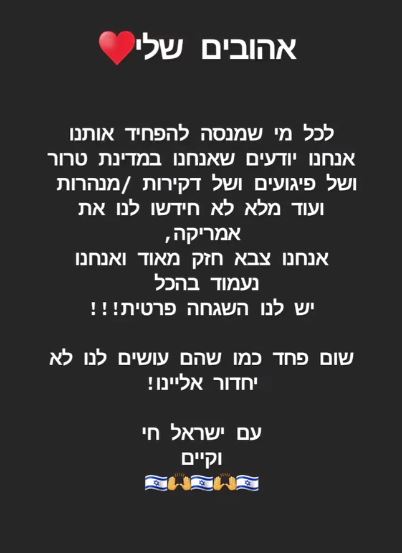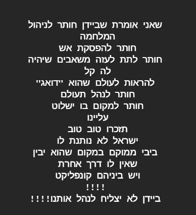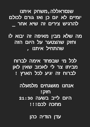 בין הדברים שאמרה בלייב בשבוע שעבר: "הצפון מתחמם, העולם עוצר מלכת, אף אחד לא מקבל את מה שקורה – את הפעילות הקרקעית בעזה מנסים להפסיק בכל דרך. מי שנותן עזרה לעזה – לא באמת רוצה להילחם, נסראללה מנסה לגרום לנו לפחד אבל כרגע זו פעולת נקמה / הפחדה, הוא לא באמת רואה או מבין את היכולות של ישראל עד הסוף. נסראללה מנסה להכניס מדינות יחד, כולל "לעשות לנו הפתעה" – מה שישים אותו בעמדה שהוא לא חושב – מבחינתו אנחנו לא ממש נילחם, אלא רק נטפטף ויש בנו פחד אבל אנחנו, ישראל מתחילים לבנות תוכניות חדשות מול הלחימה הכוללת כך שתהיה מלחמה גם עם לבנון וגם עם עזה במקביל!