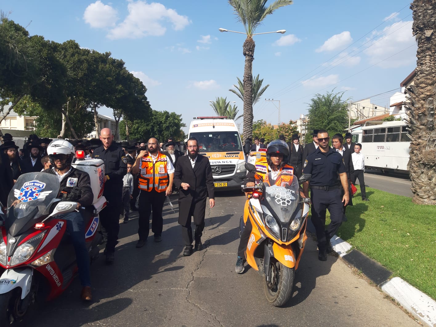 אמבולנסים וניידת טיפול נמרץ של איחוד הצלה בסיוע חובשים מיחידת האופנועים של איחוד הצלה אבטחו רפואית את שלומם של משתתפי מסע הלוויתו של כ"ק האדמו"ר הגאון הצדיק רבי ישראל ניסן רוזנבוים זצ"ל קרית גת.