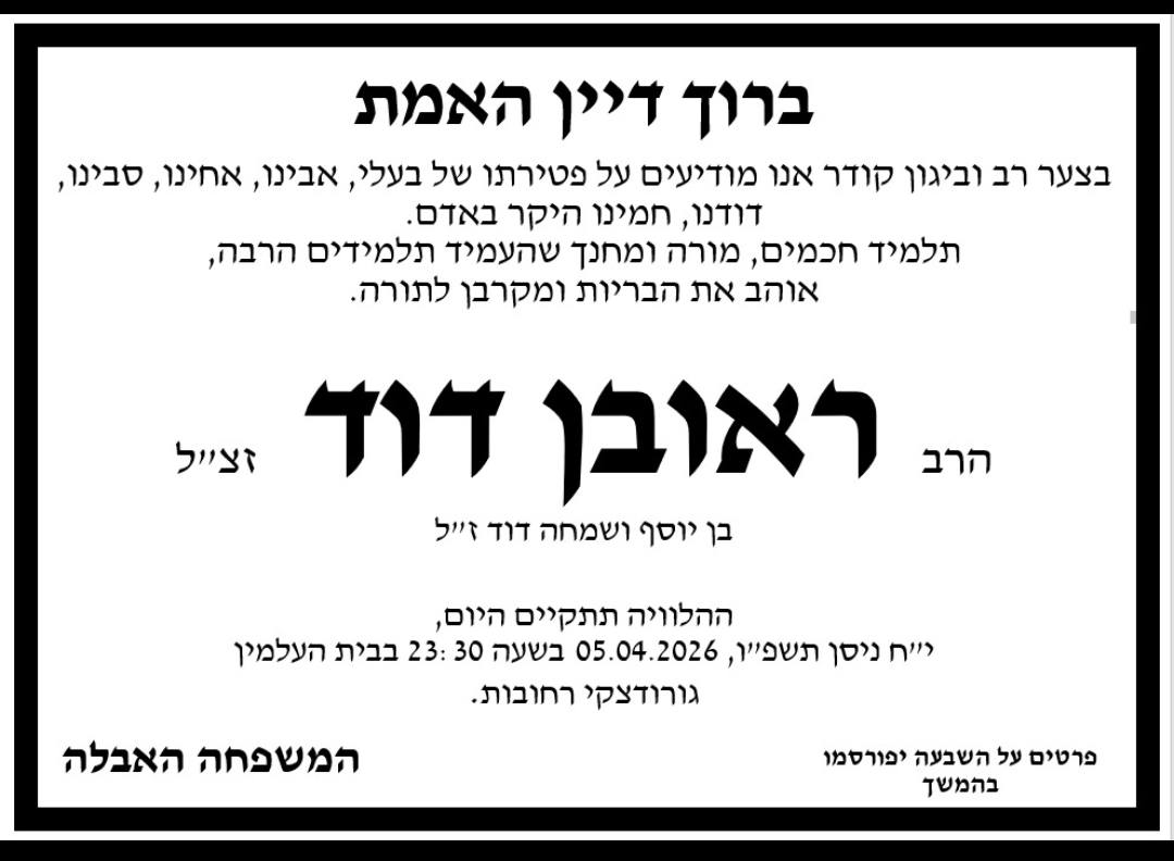 קהילת העיר רחובות והציבור הדתי-לאומי מתעטפים הערב באבל עם פטירתו של הרב ראובן דוד זצ"ל, מי שהיה דמות רוחנית וחינוכית מרכזית בעיר במשך עשרות שנים. הרב, שהזדכך בייסורים בתקופה האחרונה, הלך לעולמו כשהוא מותיר אחריו מורשת ענפה של תורה, עצה ותבונה שהנחתה אלפי תלמידים ותושבים ברחבי העיר.