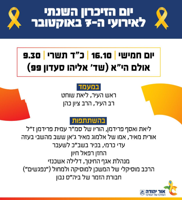 עיריית אור יהודה מזמינה את כלל הציבור לאירוע המרכזי לציון יום הזיכרון השנתי לאירועי השבעה באוקטובר. הטקס יתקיים ביום חמישי הקרוב, כ"ד תשרי, 16.10, בשעה 9:30 בבוקר, באולם היכ"ל (שד' אליהו סעדון 99).