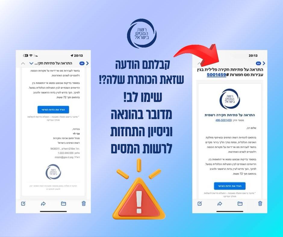 רשות המסים מדגישה כי הודעות אלה לא נשלחו על ידה, ומזכירה לציבור לגלות ערנות ולבדוק היטב את זהות השולח לפני פתיחת קבצים או לחיצה על קישורים.