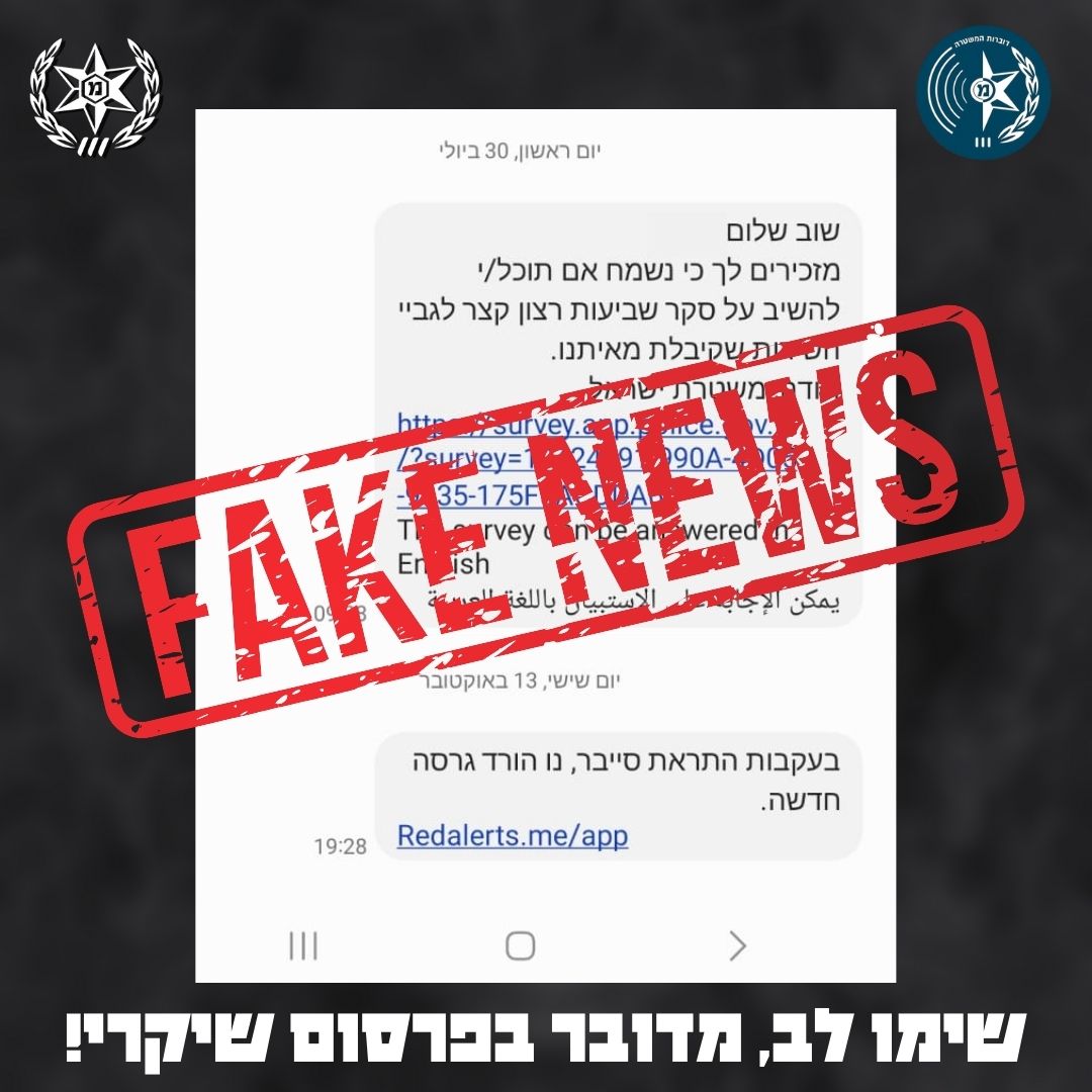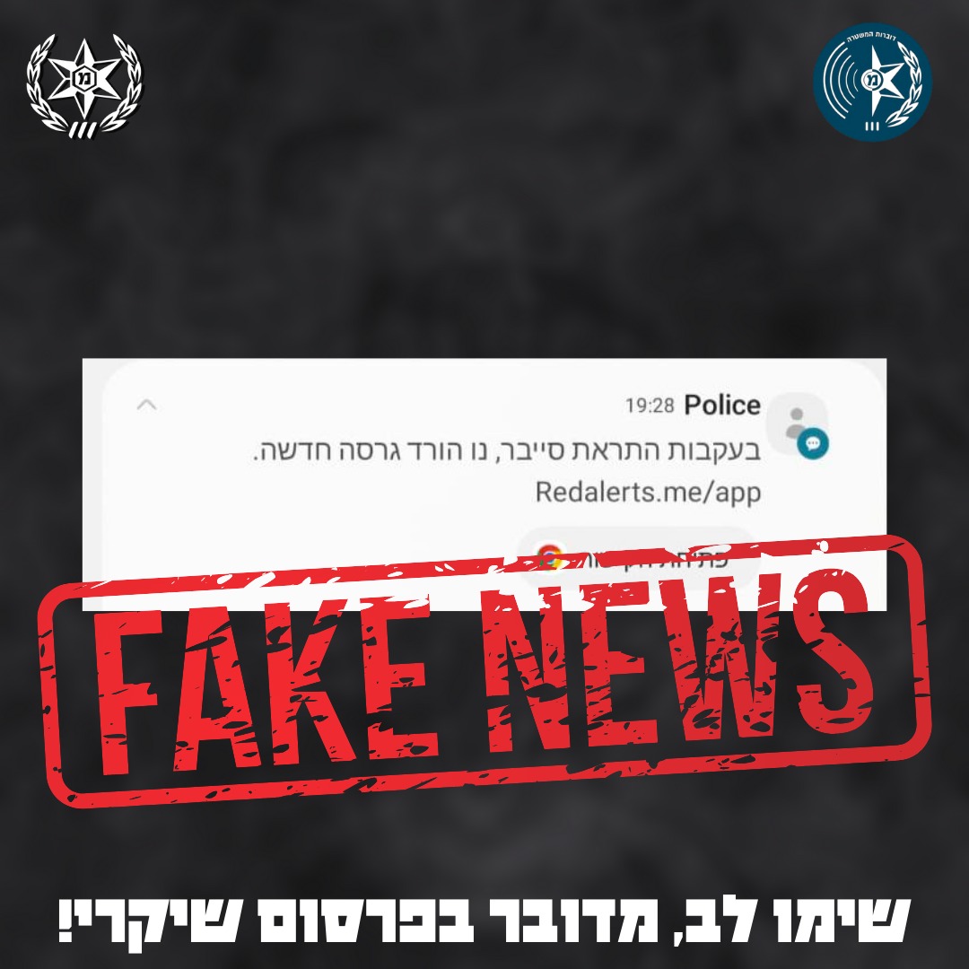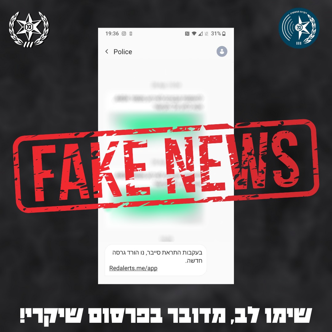 בנוסף, מזהירה משטרת ישראל היום כי בקרב הציבור מתקבלות הודעות טקסט: ״בעקבות התראת סייבר- להוריד גרסה חדשה" בצירוף קישור. מדובר בהודעת כזב ואנו קוראים לציבור לא להכנס לקישור ולמחוק את ההודעה. ככלל- משטרת ישראל אינה מבקשת עדכון פרטי אזרחים באמצעות קישוריות ברשת, לפיכך – יש להימנע מפתיחת "לינקים" ממקור לא ידוע.