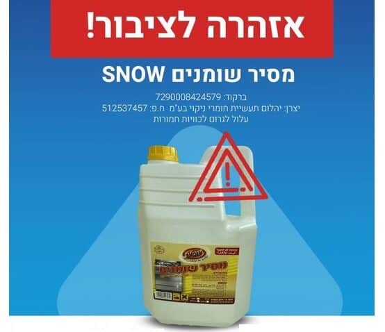 הממונה על התקינה במשרד הכלכלה והתעשייה, קורא לציבור להפסיק מיידית את השימוש במוצר מסיר שומנים SNOW העלול לגרום לכוויות חמורות.