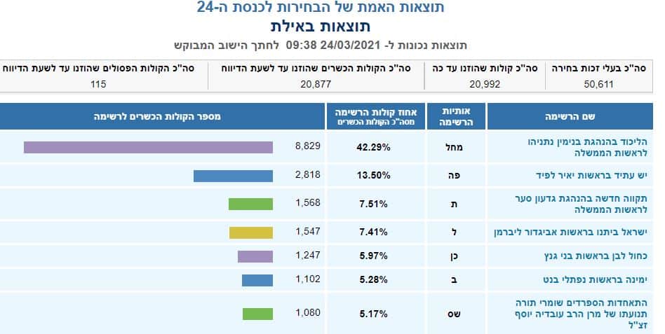 כפי שפרסמנו הבוקר בחדשות 08, באילת לא היו לגדעון סער, מאיר יצחק הלוי ושות' לסיעה מצביעים רבים. הליכוד גרף 42.29% מהקולות, יש עתיד 13.5% מהקולות ואילו תקוה חדשה – במקום השלישי עם 7.51% מהקולות – רק 1,568 איש הצביעו לסער ומאיר יצחק הלוי.