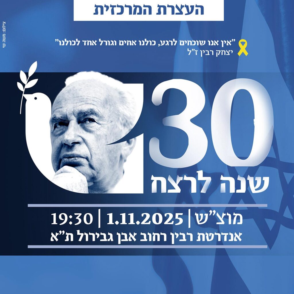 אחרי שבחמש השנים האחרונות לא התקיימה: העצרת המרכזית לזכרו של ראש הממשלה יצחק רבין ז״ל תתקיים השנה במתכונת מיוחדת לציון שלושה עשורים להירצחו, במוצאי שבת, ה-1 בנובמבר 2025, בשעה 19:30, בסמוך לאנדרטת רבין ברחוב אבן גבירול.