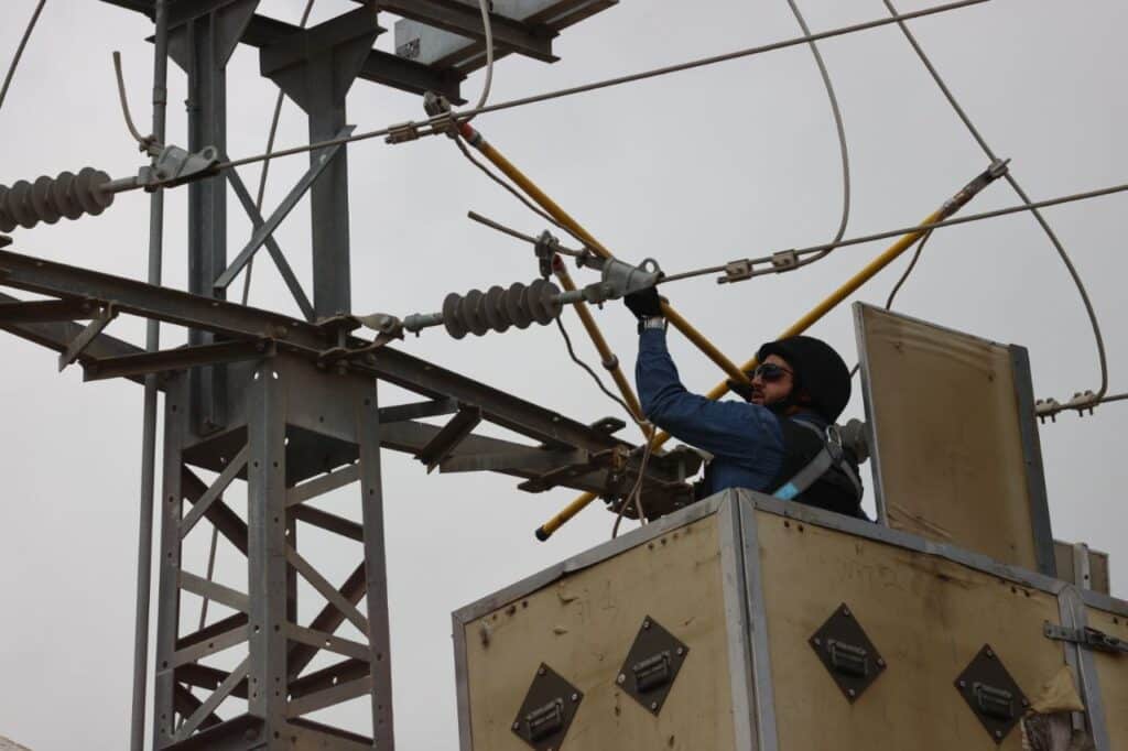 צוותי חברת החשמל תיקנו את נזקי הירי על רשת החשמל בעוטף קיבוץ ניר עוז, בסמוך לגדר המערכת מול ח'אן-יונס