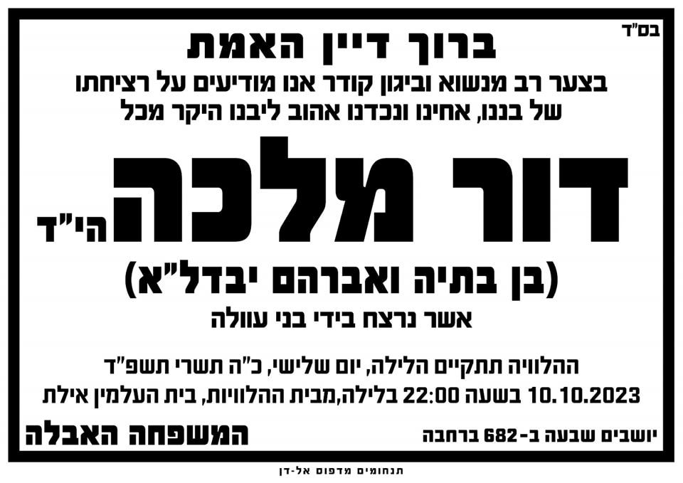 דור ז"ל, בנם של בתיה ואברהם יבדל"א, יובא למנוחות הלילה (שלישי, 10.10.23) בבית העלמין באילת. משפחתו תשב שבעה ב-682 ברחבה.