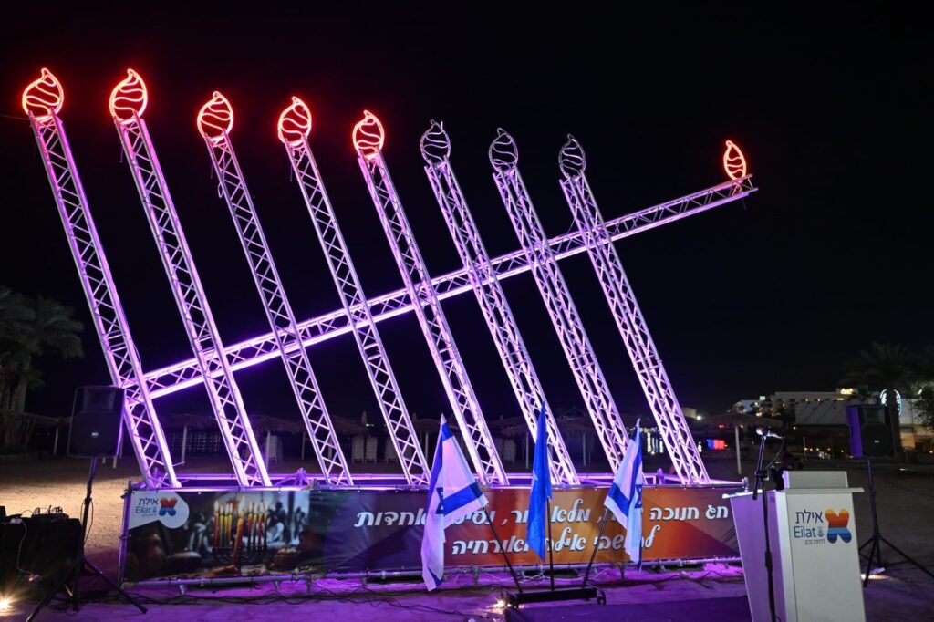 בטקס שערכה העירייה בחנוכייה המעוצבת שהוצבה בטיילת, השתתפו דקלה מנצור ספיר – תושבת העיר ובתו של שלמה מנצור החטוף המבוגר ביותר, נועם ספיר – בתה של דקלה ונכדתו של שלמה ועומר מצגר – נכדתו של יורם מצגר ז״ל שנחטף ונרצח בשבי החמאס. עוד השתתפו ראש העירייה – אלי לנקרי, חברי מועצת העיר, ביניהם גבי קדוש – נציג מינהלת החטופים באילת, תושבים ואורחי העיר, שהצטרפו לתפילה לשובם של כולם.