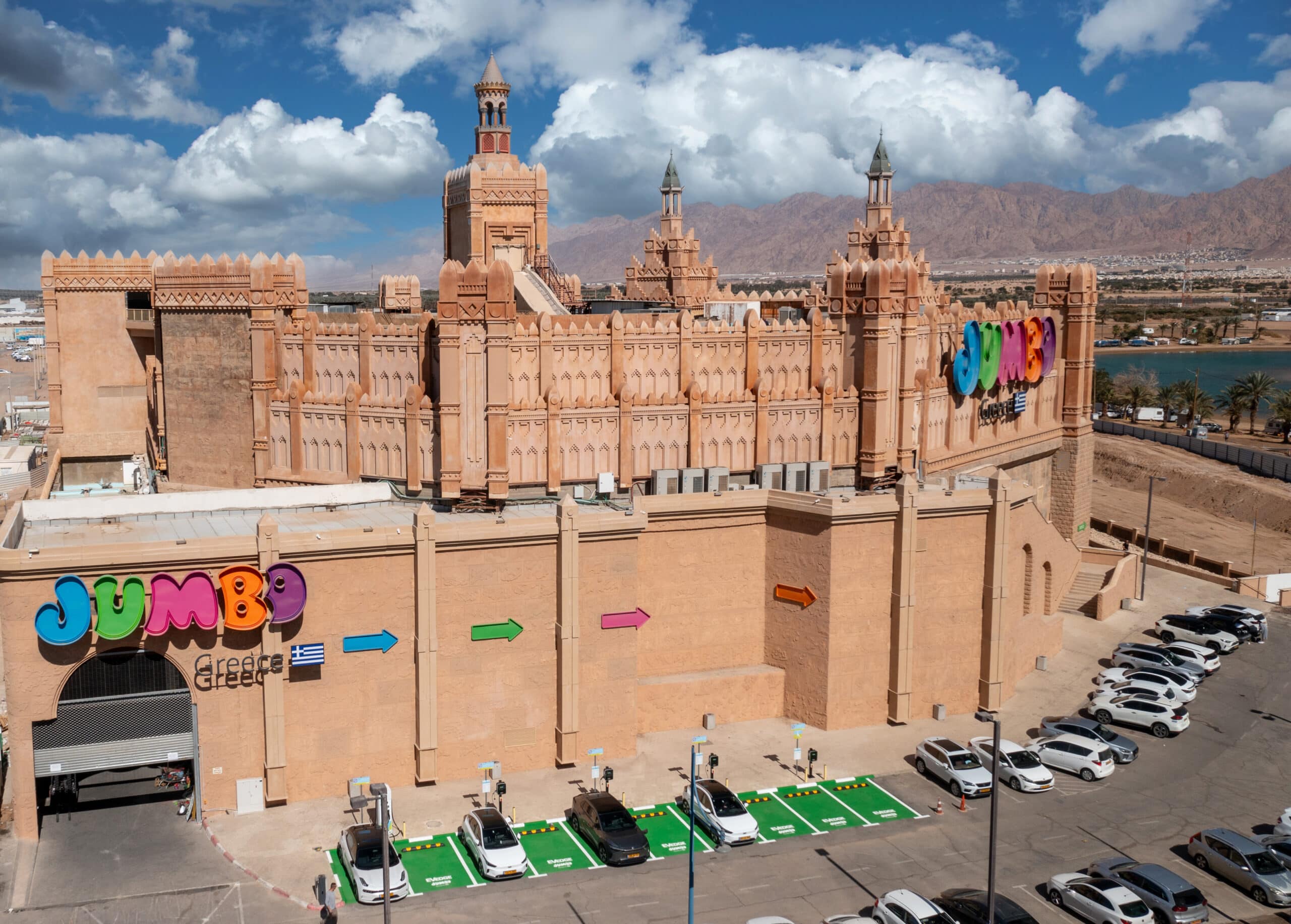 המתחם יאפשר טעינה של עד 20 מכוניות בעת ובעונה אחת. בזמן ההטענה של רכביהם יוכלו באי המתחם ליהנות מחוויית הקניות המיוחדת בג'מבו יוון ואף ליהנות בהמשך מהטבות אטרקטיביות בטעינת הרכבים. ג'מבו יוון באילת הינה החנות הראשונה שנפתחה לרשת ומשתרעת על פני שטח של כ-10,000 מ"ר ב-2 קומות מסחר גדולות מאוד ומציעה מעל 1,000,000 פריטים ובמגוון קטגוריות כגון: כלים ונוי לבית, ביגוד ואביזרים, צעצועים וכלי כתיבה, מוצרי תינוקות, מוצרי ניקיון, טואלטיקה, מוצרי ספורט, מוצרים לבע"ח, פריטים עונתיים ועוד.