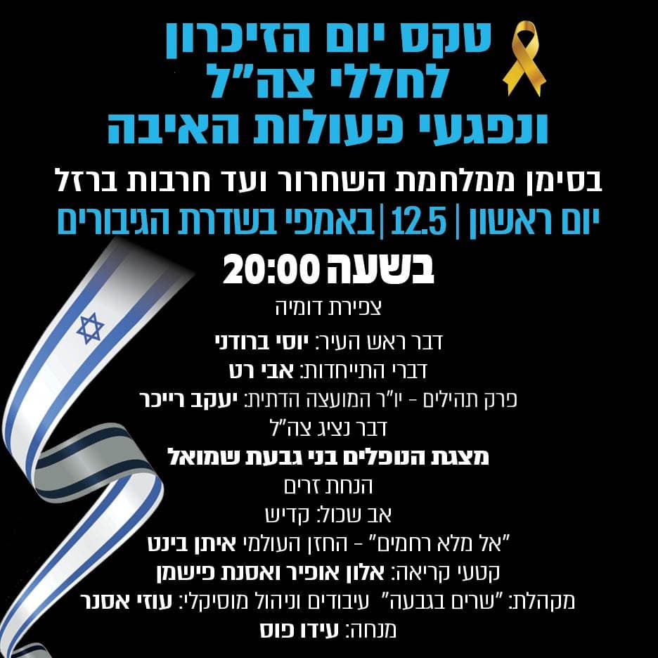 יום ראשון, 12.5.2024, 20:00 באמפי בשדרת הגיבורים. הטקס ישודר בשידור חי בפייסבוק