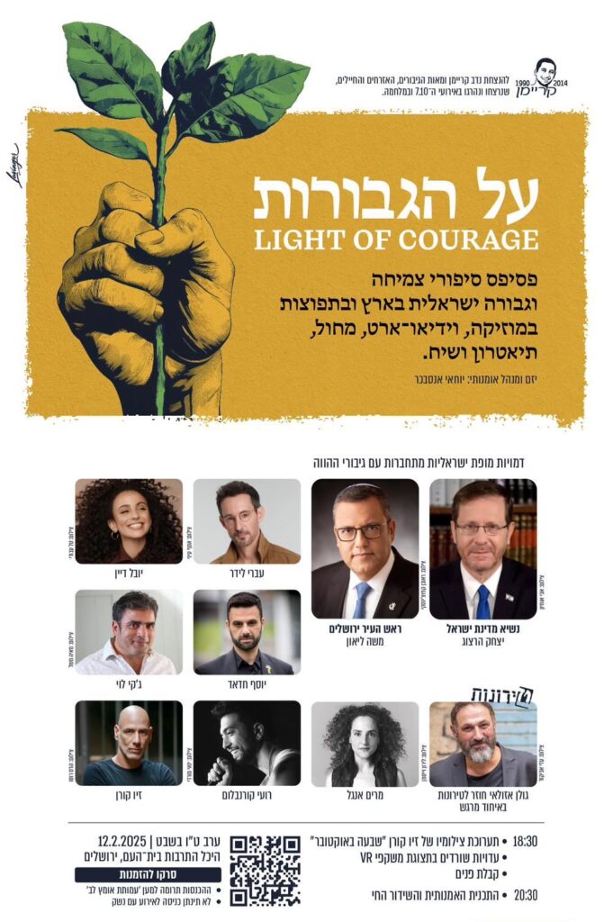 האירוע יתקיים בערב ט"ו בשבט, 12.2, וישתתפו בו נשיא המדינה בוזי הרצוג, ראש עיריית ירושלים משה לאון, עברי לידר, יובל דיין, יוסף חדד, הצלם זיו קורן ואומנים נוספים. האירוע מהווה הזדמנות ייחודית לחשוף את רגעי הכוח והתקווה של דמויות מובילות מעולמות שונים, אשר יובילו דיון מעמיק על משמעות הגבורה והתקווה בחברה הישראלית, ובחיזוק הקשרים בין הקהילות השונות בישראל ובתפוצות.