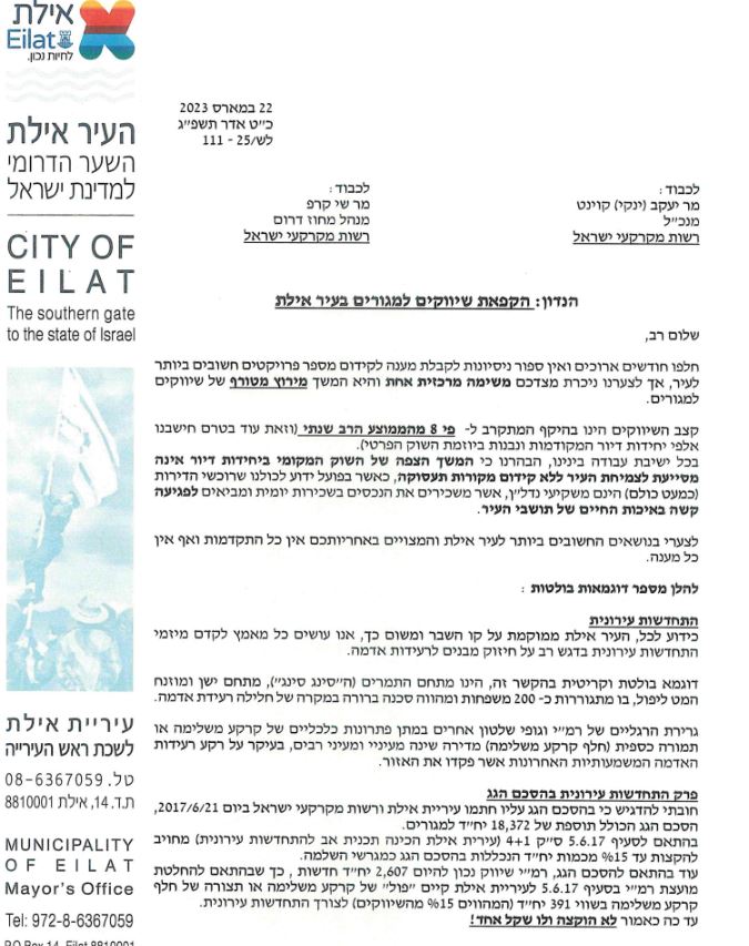 בפנייתו הדגיש ראש העירייה, כי המשך הצפה של השוק המקומי ביחידות דיור אינה מסייעת לצמיחת העיר ללא קידום מקורות תעסוקה, כאשר בפועל ידוע כי רוב רוכשי הדירות הינם משקיעי נדל"ן, אשר משכירים את הנכסים בשכירות יומית ומביאים לפגיעה קשה באיכות החיים של תושבי העיר. "לצערי בנושאים החשובים ביותר לעיר אילת והמצויים באחריותכם אין כל התקדמות ואף אין כל מענה" הבהיר ראש העירייה וציין בתוכם את תחומי ההתחדשות העירונית, דיור מוגן, פרויקט הקרולינות, הרחבת מקורות התעסוקה ועוד.