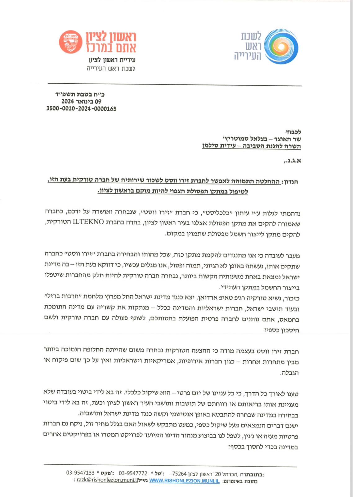 אתמול, יום שלישי ה-9.1.24 שלח ראש עיריית ראשון לציון, רז קינסטליך, מכתב בהול לשר האוצר והשרה להגנת הסביבה בבקשה למנוע במיידי מחברת זירו ווסט שמקימה את המפעל, להתקשר עם חברה טורקית שצפויה לטפל בייצור החשמל במפעל העתידי.
