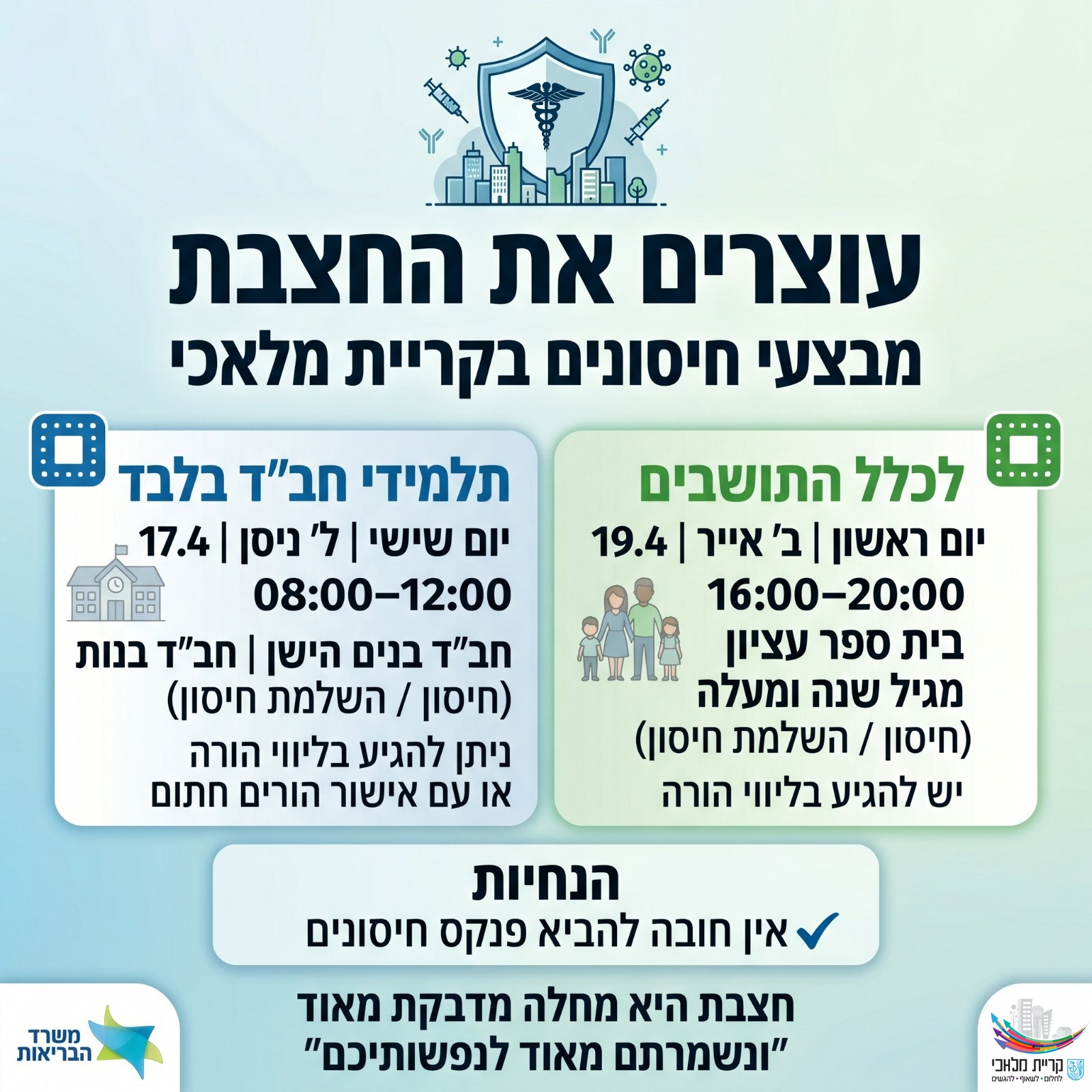 עיריית קריית מלאכי ולשכת הבריאות המחוזית אשקלון הודיעו על פתיחת מבצע חיסונים ייעודי, בעקבות עלייה מדאיגה במספר מקרי החצבת בעיר.