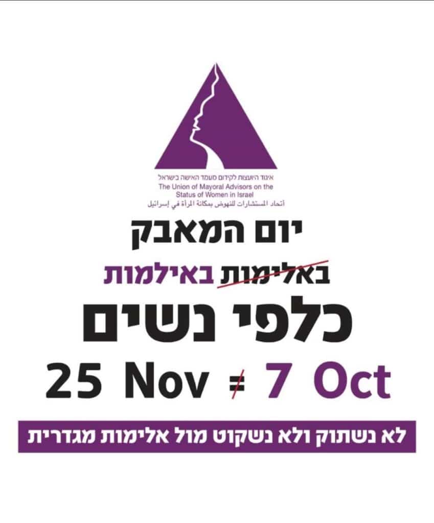 השנה, לאור הטבח הנורא שביצע ארגון חמאס באזרחי ישראל והאלימות הברוטאלית כנגד נשים וילדים, החליטו באיגוד היועצות לקידום מעמד האישה לייחד את יום האלימות הבינלאומי כלפי אנשים גם כיום אילמות כלפי נשים. זאת לאור השתיקה הרועמת של ארגון האו"ם וארגוני נשים בעולם.