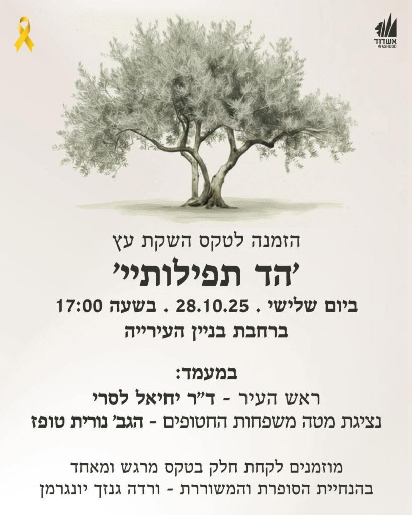 אשדוד בוחרת לשתול דווקא עץ, כי לפעמים שורשים של זיכרון הם הדרך להצמיח עתיד של תיקון. עץ הזית שיינטע ביום שלישי יעמוד לא רק כסמל של זיכרון, אלא כהזמנה שקטה להמשיך להאמין באור, גם כשנדמה שהעולם חשוך.