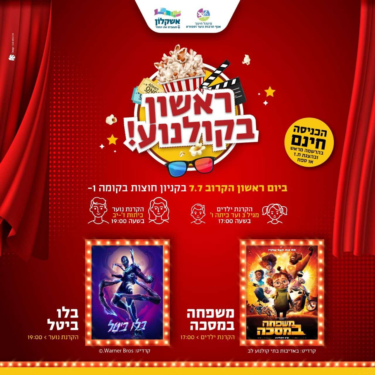 החל מיום ראשון הקרוב (7.7.) ומידי כל יום ראשון במהלך חודש יולי עיריית אשקלון תקיים הקרנת סרטי ילדים ונוער בקניון חוצות בקומה 1-.