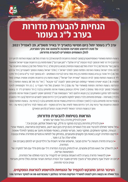 ביום חמישי האחרון הוציאה הרשות הארצית לכבאות והצלה צו על איסור הדלקת מדורות במועד ובאזורים מסוימים בשל תנאי מזג אוויר המעלים את הסבירות להתרחשות דליקות. על פי הצו, תינתן האפשרות להדלקת מדורות אך ורק באזורים שהוכשרו על ידי הרשויות המקומיות וקיבלו אישור של הרשות הארצית לכבאות והצלה. השנה, כדי לצמצם את זיהום האוויר ועדיין לאפשר קיום של החגיגות והמסורת, העירייה נערכה מבעוד מועד ותאפשר הדלקת מדורות במספר מוקדים שונים.