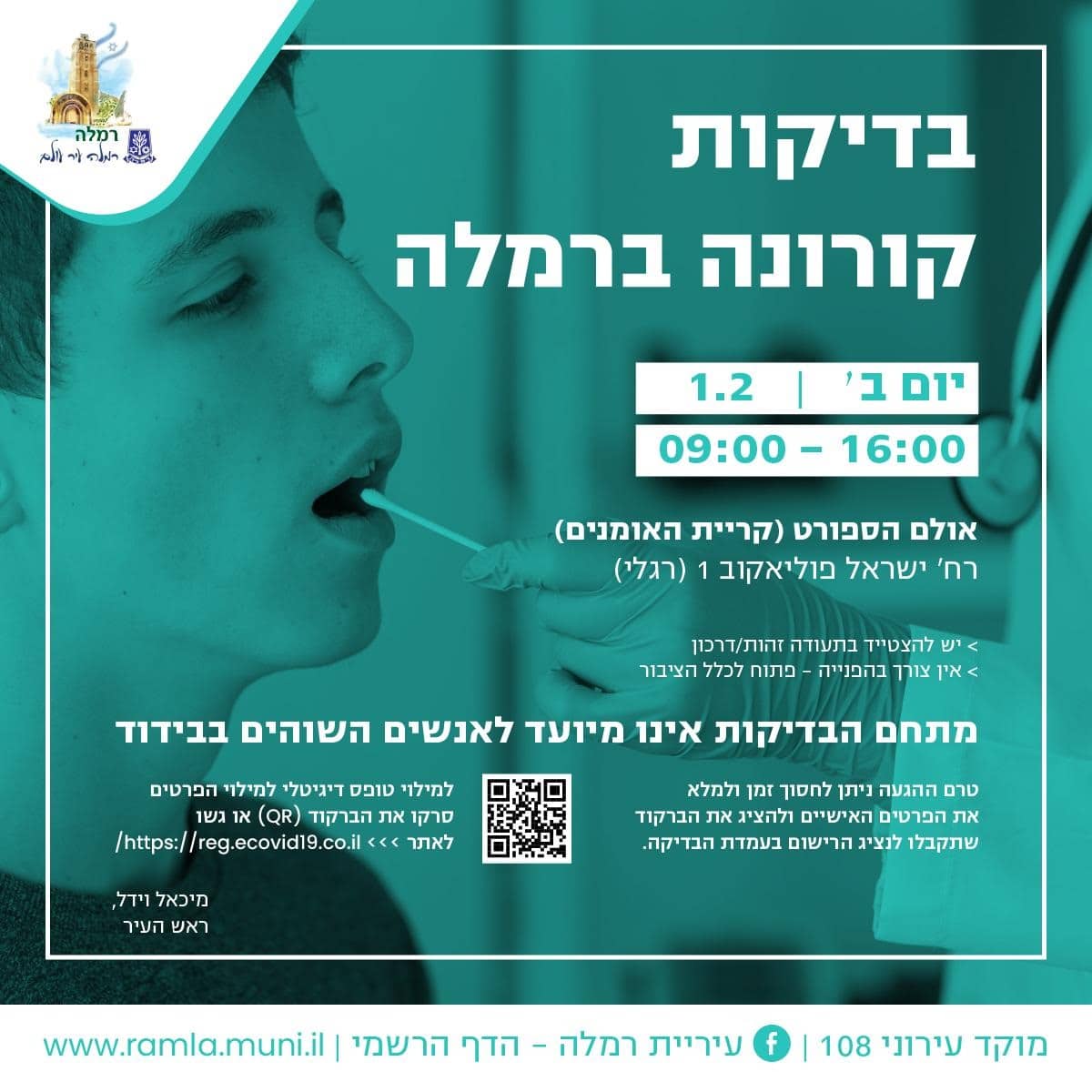 ביום שישי ייערכו בדיקות קורונה אולם עדיין לא ידוע היכן. בעירית רמלה אומרים כי הדבר תלוי במזג האוויר וכי הודעה בנושא תצא בהמשך השבוע.