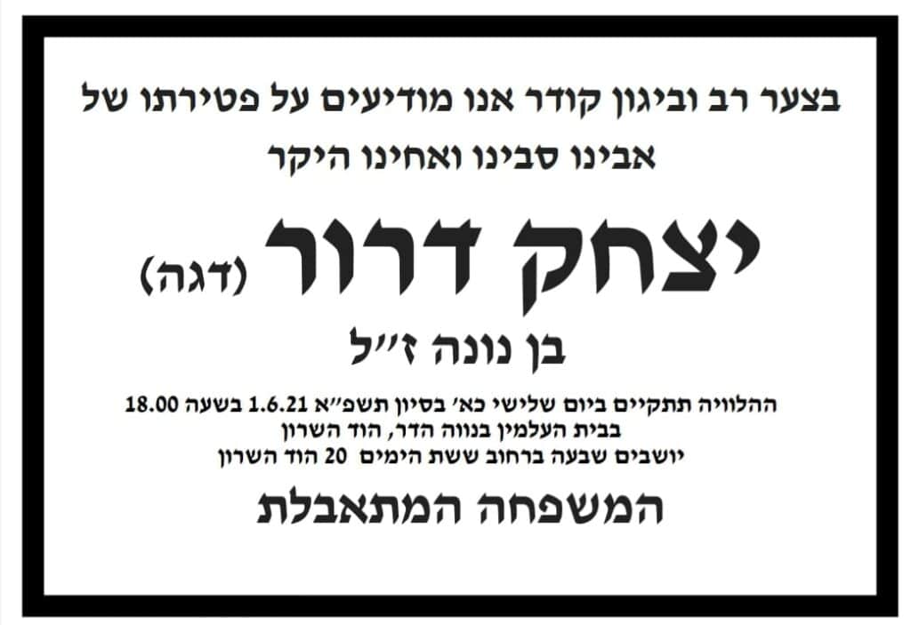 רבים ליוו אמש (שלישי) למנוחות את יצחק דרור, אביו של של ראש מועצת גן יבנה, דרור אהרון. יצחק הובא למנוחות בבית העלמין בהוד השרון. דרור אהרון, הודיע על פטירת אביו: "בצער רב וביגון קודר אני נאלץ להודיע על פטירתו של אבי היקר יצחק בן נונה ז"ל תהא נשמתו צרורה בצרור החיים. אמן". היום (רביעי), ישב דרור אהרון שבעה ברחוב ששת הימים 20 בהוד השרון והחל מיום חמישי ועד שבת, ישב בביתו שברחוב הקציר 20 בגן יבנה.  מערכת חדשות 08 משתתפת בצערו הכבד של ראש המועצה דרור אהרון על לכתו של אביו האהוב.