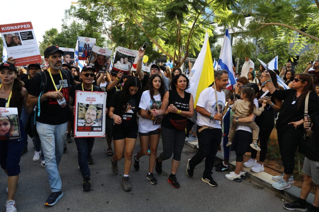 הצעדה לוותה בדגלים ותמונות של החטופים והחטופות, על ידי אלפי תושבים ואזרחים כואבים ובהם ראש העיר, חיים ביבס ונבחרי ציבור נוספים, שהגיעו לתמוך ולחזק באופן מרגש את המשפחות.