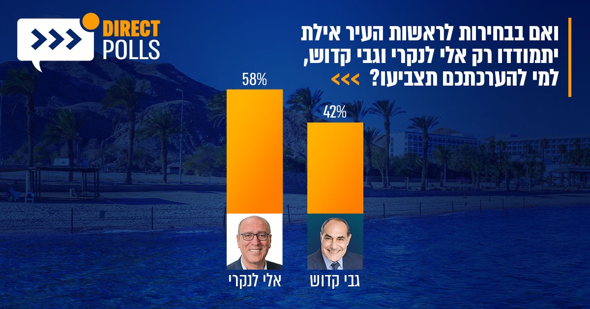 במדגם שנערך באמצעות חברת הסקרים בתחילת השבוע, ותוצאותיו נחשפות כאן לראשונה, עולה כי אילו הבחירות לראשות העיר אילת היו נערכות היום, אלי לנקרי, ראש העיר המכהן, מנצח כבר בסיבוב ראשון עם 45% תמיכה. אחריו ברשימה גבי קדוש עם 33% תמיכה, כאשר סוגרים את הרשימה סוזי שרם – כהן ומתן בארי, עם 11% תמיכה לכל אחד מהם.
