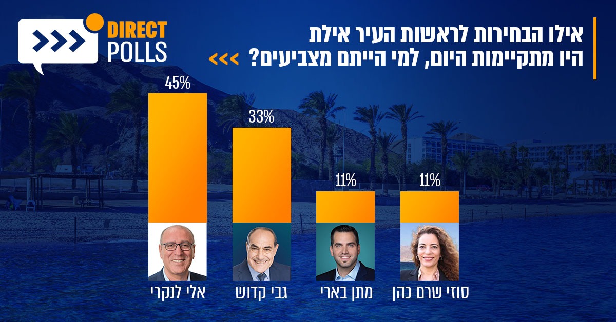 במדגם שנערך באמצעות חברת הסקרים בתחילת השבוע, ותוצאותיו נחשפות כאן לראשונה, עולה כי אילו הבחירות לראשות העיר אילת היו נערכות היום, אלי לנקרי, ראש העיר המכהן, מנצח כבר בסיבוב ראשון עם 45% תמיכה. אחריו ברשימה גבי קדוש עם 33% תמיכה, כאשר סוגרים את הרשימה סוזי שרם – כהן ומתן בארי, עם 11% תמיכה לכל אחד מהם.