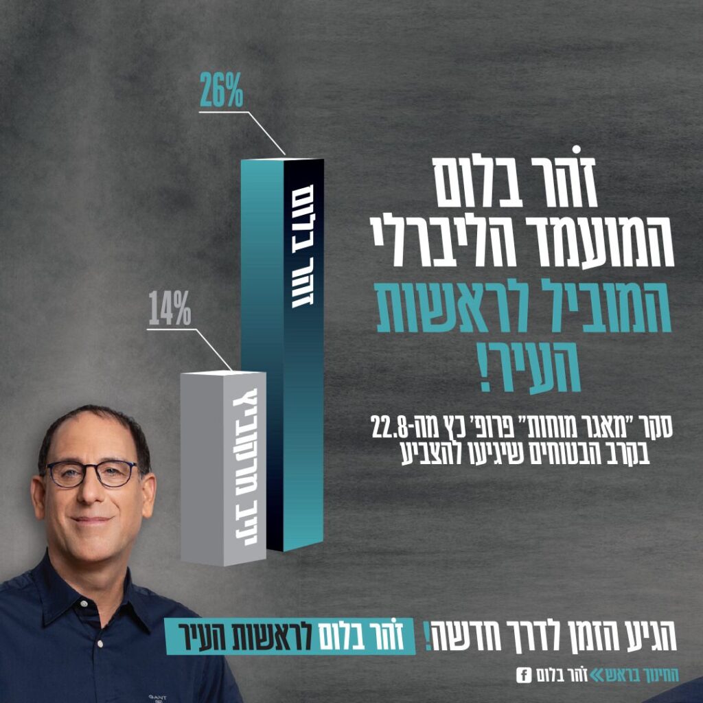 יממה לאחר שיניב מרקוביץ' קרא ליתר המועמדים הליברליים להתלכד, עושה זאת זהר בלום, המועמד לראשות העיר ומוסיף סקר בו הוא מוביל.