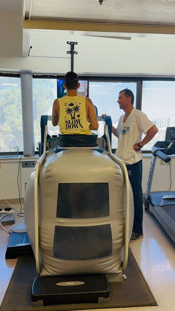 בתמונות והוידאו, דביר והפזיותרפיסט שלו במחלקת השיקום, בפעילות על מכשיר האנטי גראביטי.