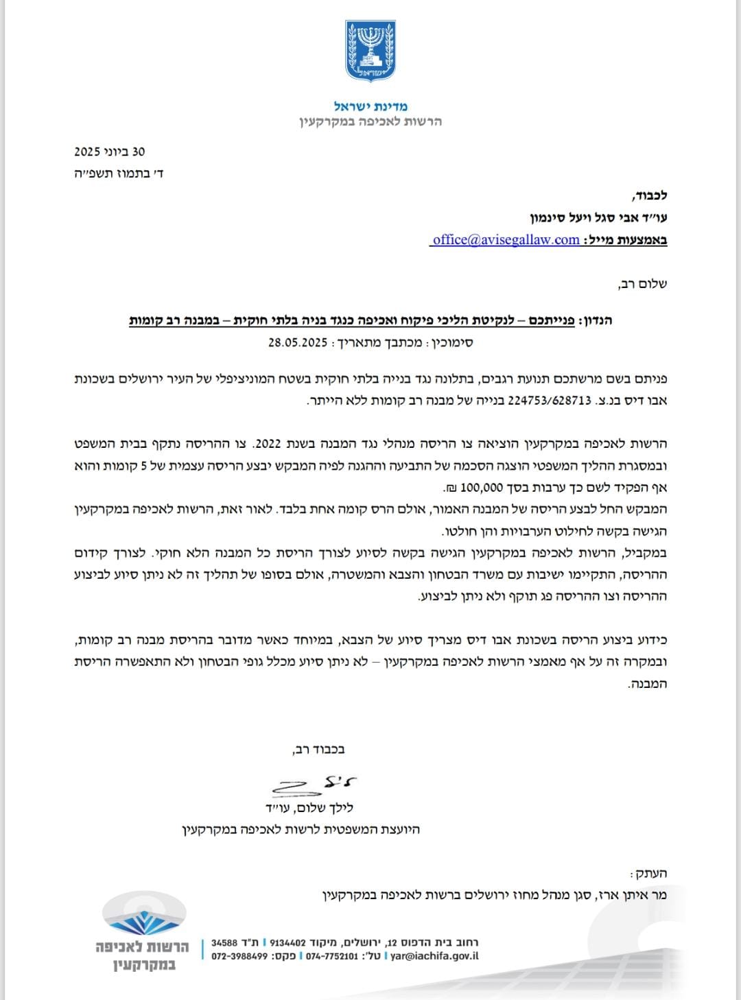 במענה לרגבים ציינה הרשות לאכיפה במקרקעין כי הוצא על ידה צו הריסה מנהלי כנגד המבנה הבלתי חוקי כבר בשנת 2022. במסגרת ההליך המשפטי הוצגה הסכמה של התביעה וההגנה, לפיה הקבלן יבצע הריסה עצמית של 5 קומות, והוא אף הפקיד לשם כך ערבות בסך 100,000 ₪. בפועל, הוא החל לבצע הריסה קלה של קומה אחת בלבד, ולאור זאת חולטה הערבות, במקביל לתכנון האכיפה במלואה.