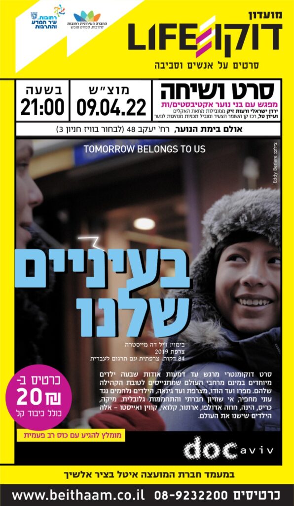 במסגרת מועדון "דוקו לייף" יוקרן במוצ"ש הקרוב 9/4, 21:00 הסרט הדוקומנטרי עטור הפרסים "בעיניים שלנו". סרט מרגש עד דמעות, על שבעה ילדים מיוחדים במינם מרחבי העולם שמתגייסים לטובת הקהילה שלהם וזכו להכרה בינלאומית. הילדים ממדינות פרו ועד הודו, מצרפת ועד גינאה – נלחמים נגד עוני מחפיר, אי שיוויון חברתי והתחממות גלובלית. לפני ההקרנה יתקיים מפגש עם שתי נערות פעילות מהעיר רחובות, המובילות את מחאת האקלים: רעות זיק חייט וירדן ישראלי לצד עידן טל, מחנך ופעיל חברתי וסביבתי, רכז השומר הצעיר בעיר מזה חמש שנים