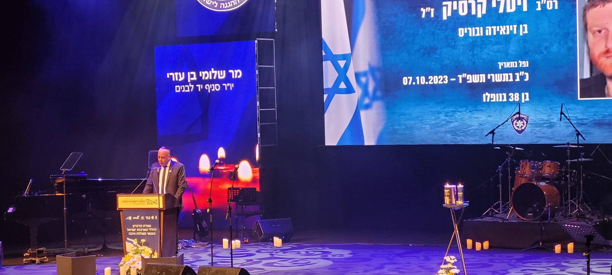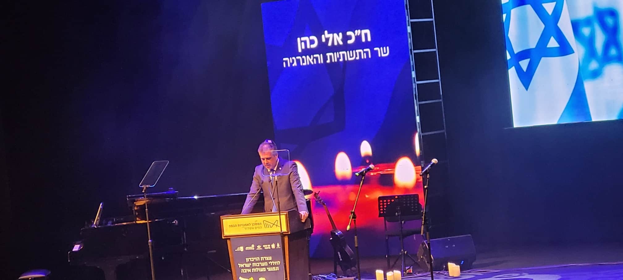 שר האנרגיה ח"כ אלי כהן, נשא דברים בשם ממשלת ישראל. הוא דיבר על שבוע הזיכרון שתחילתו בחללי השואה וסיומו בחללי מערכות ישראל ופעולות האיבה, ואמר כי "מול השמחה והגאווה על עצמאותנו, השנה אנו מרגישים זאת ביתר שאת לאור ההתקפה הברוטאלית באירועי אוקטובר. הוא הזכיר את 132 החטופים והדגיש את מחויבות המדינה לעשות הכל על מנת להשיבם הביתה – למשפחותיהם". אירועי ה-7 מזכירים לנו כי אויבנו מבקשים לפגוע בנו ועל כל העולם לדעת שאנו נלחם גם אם נישאר לבד. יחד עם זאת, הוא קרא לקהילה הבינלאומית לא לעמוד מנגד אלא להיות בצד הנכון של ההיסטוריה, וחתם מתוך שיר הרעות: "אך נזכור את כולם, את יפי הבלורית והתואר. כי רעות שכזאת לעולם, לא תיתן את ליבנו לשכוח.."