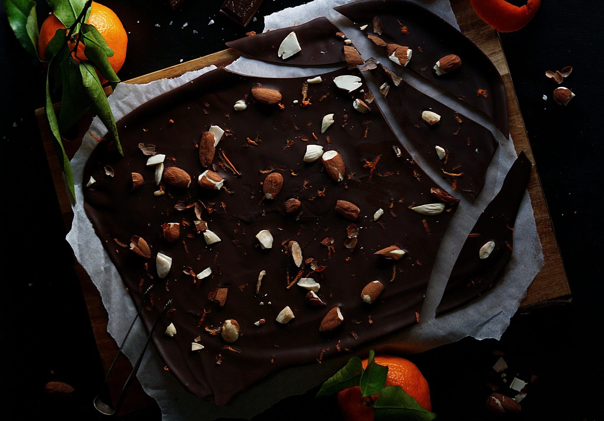 ממיסים את השוקולד בבן מארי עם קליפת התפוז ומורחים על נייר אפייה. משתדלים שהשוקולד לא יהיה דק מדי בכדי שלא יהיה שביר.