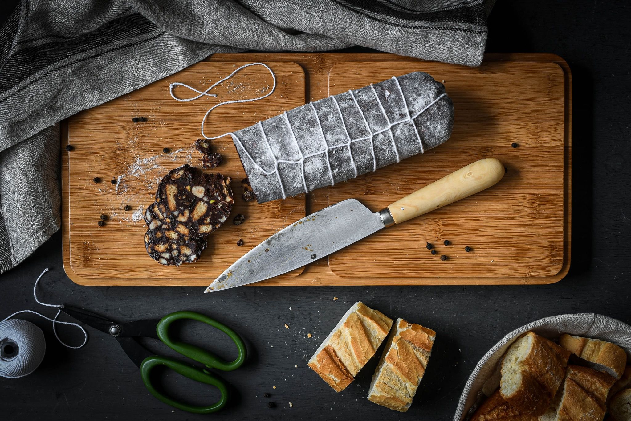 פורסים ניילון נצמד גדול, יוצקים עליו את התערובת ומגלגלים לצורת צינור. מסובבים את הצינור על עצמו וקושרים את הקצוות באמצעות חוט כדי להבטיח שהוא הדוק. מאחסנים במקרר למשך לפחות 6 שעות .
