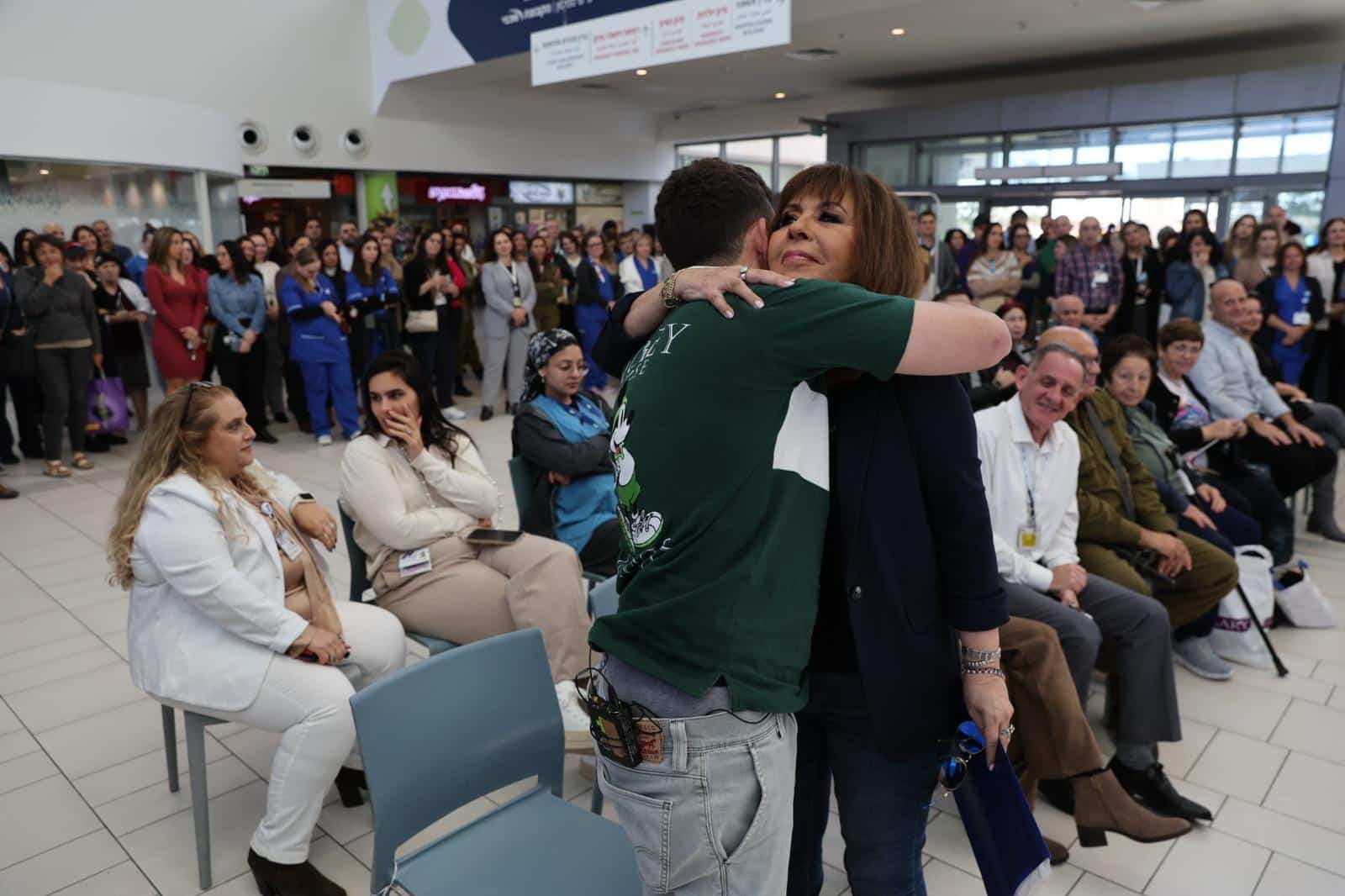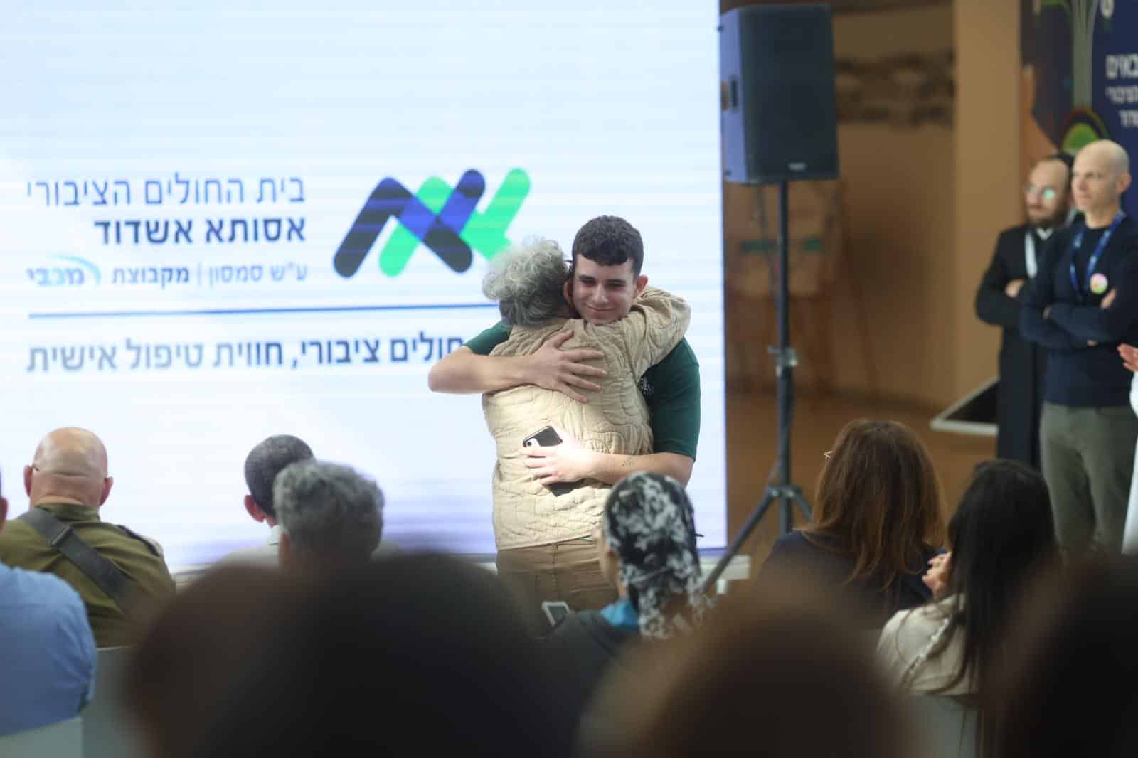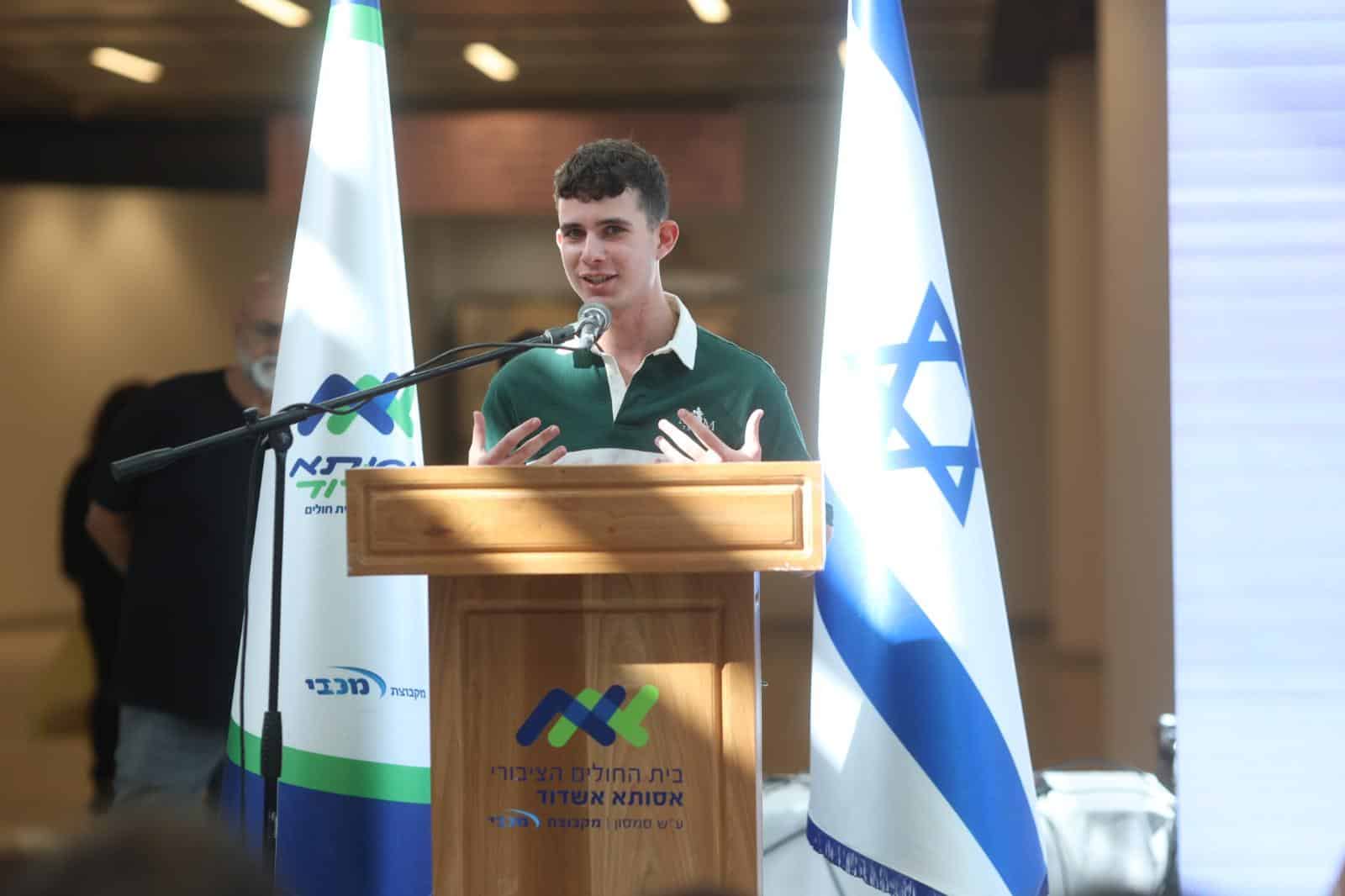 בטקס מרגש שהתקיים בבית החולים דיברו הבוקר מנכ״ל אסותא אשדוד ד״ר ארז בירנבאום, יו"ר הסתדרות האחים והאחיות אילנה כהן, תא״ל במיל' רמי חכם, ירדנה ארזי וכמובן החייל הפצוע סמל נועם.